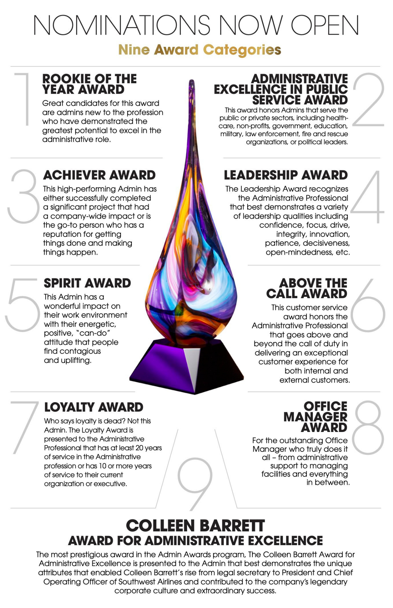 The 9th Annual Dallas-Fort Worth Admin Awards celebrates exceptional Administrative Professionals through 9 Award Categories, including the program’s most prestigious award, The Colleen Barrett Award for Administrative Excellence which elevates the professional who embodies the “spirit” and proficiency of nationally renowned (former) secretary, Colleen Barrett, President Emeritus of Southwest Airlines.