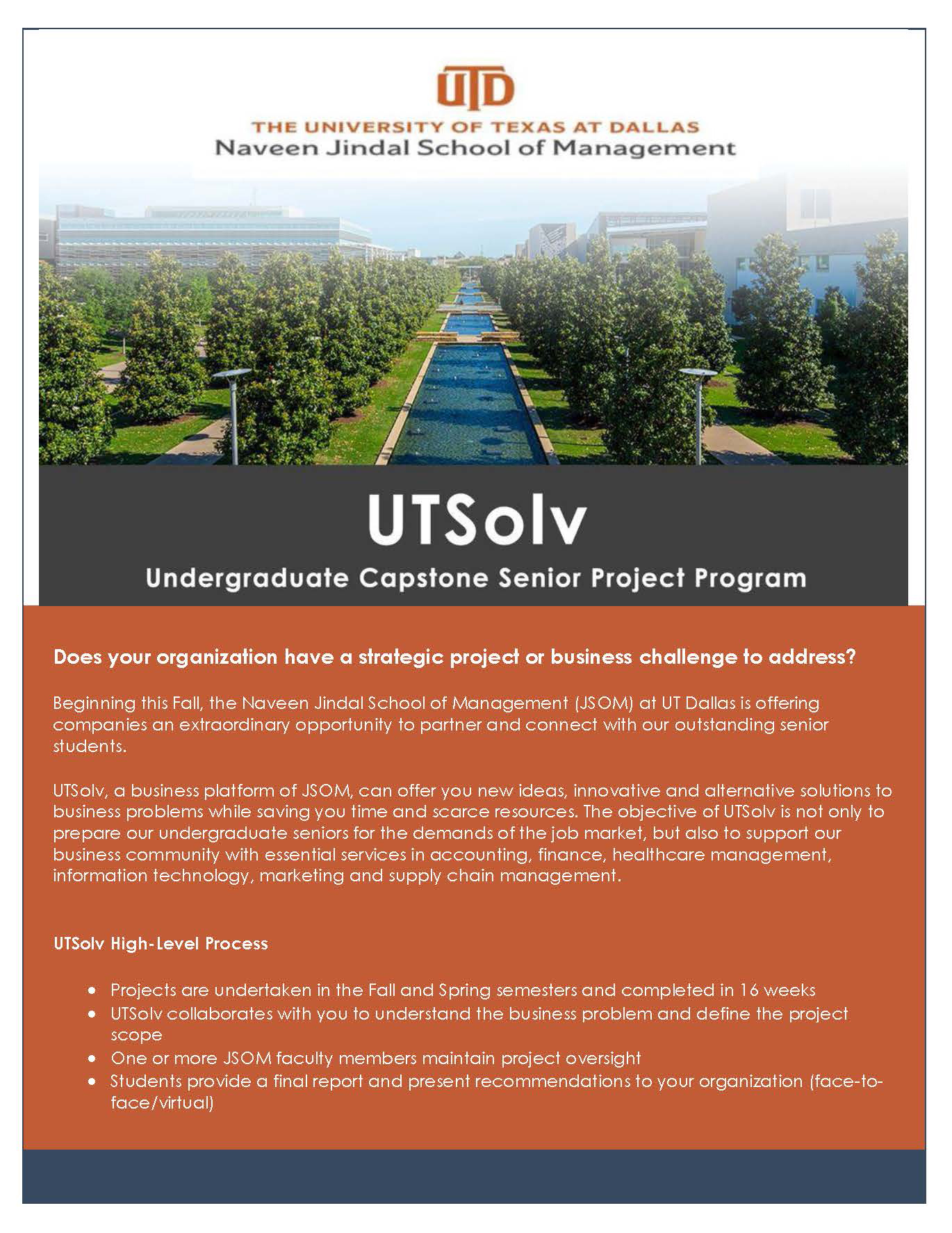 UTSolv, a business platform of JSOM, can offer you new ideas, innovative and alternative solutions to business problems while saving you time and scarce resources. The objective of UTSolv is not only to prepare our undergraduate seniors for the demands of the job market, but also to support our business community with essential services in accounting, finance, healthcare management, information technology, marketing and supply chain management.