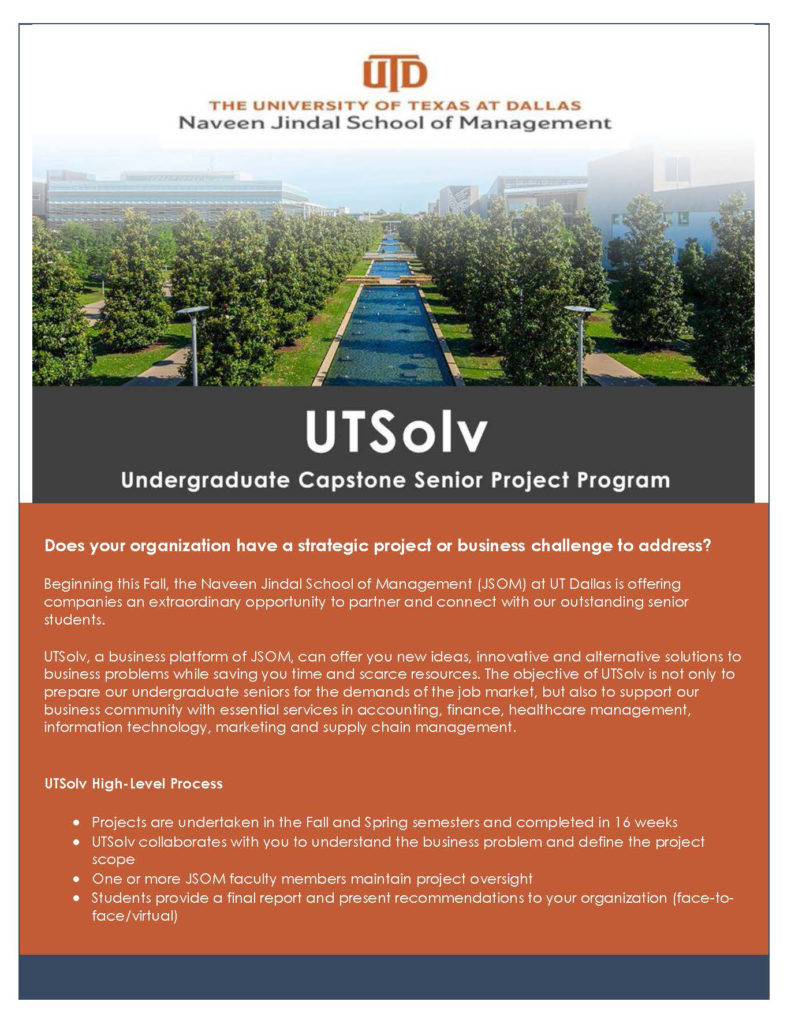 UTSolv, a business platform of JSOM, can offer you new ideas, innovative and alternative solutions to business problems while saving you time and scarce resources. The objective of UTSolv is not only to prepare our undergraduate seniors for the demands of the job market, but also to support our business community with essential services in accounting, finance, healthcare management, information technology, marketing and supply chain management.