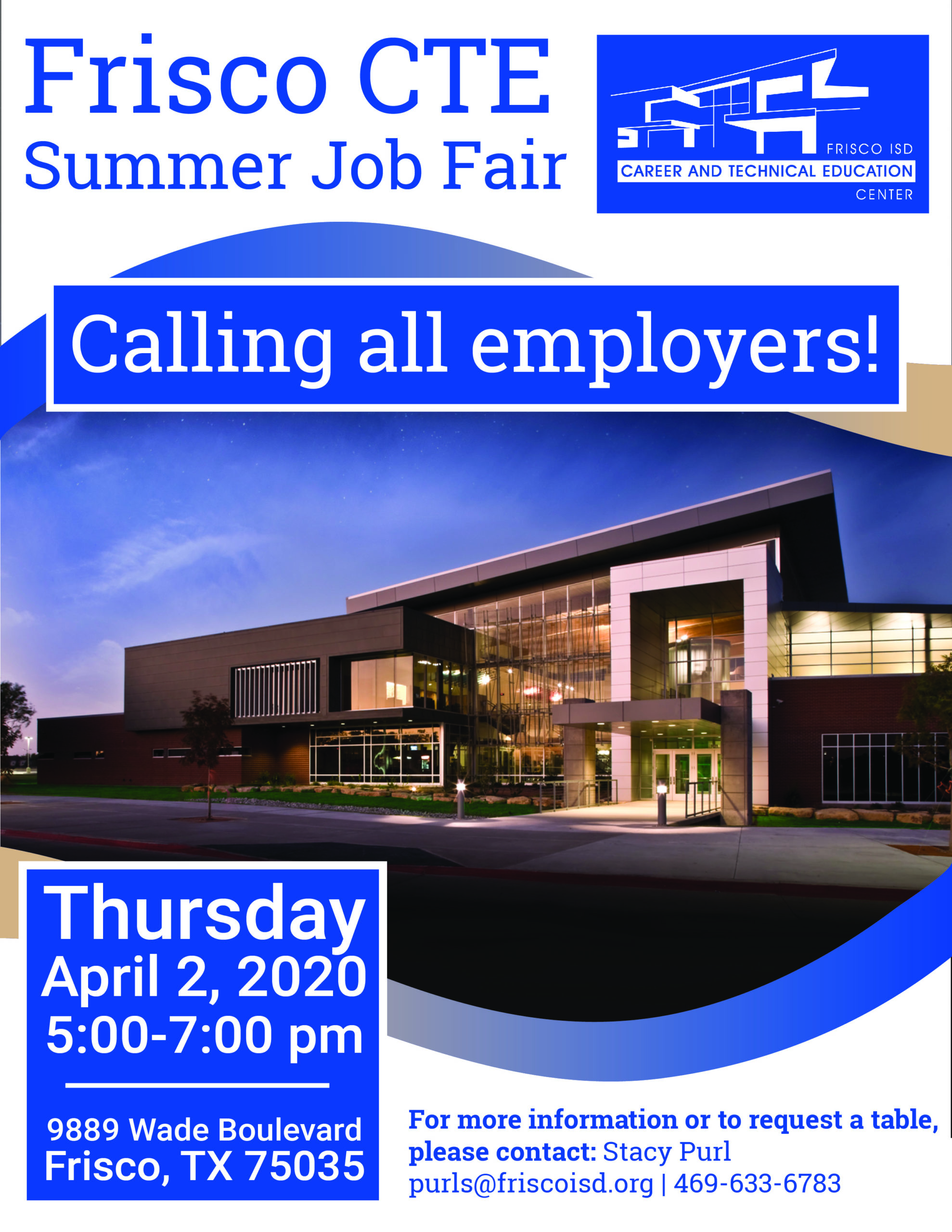 A great way to hire staff for the summer! The Frisco CTE Summer Job Fair will be on Thursday, April 2, 2020 from 5:00 PM to 7:00 PM and you can be a vendor. Last year, over 400 students ages 15-18 attended. Interested in hiring a student? Please fill out the registration form here. You will receive additional information from the Frisco ISD Career & Technical Education Center.