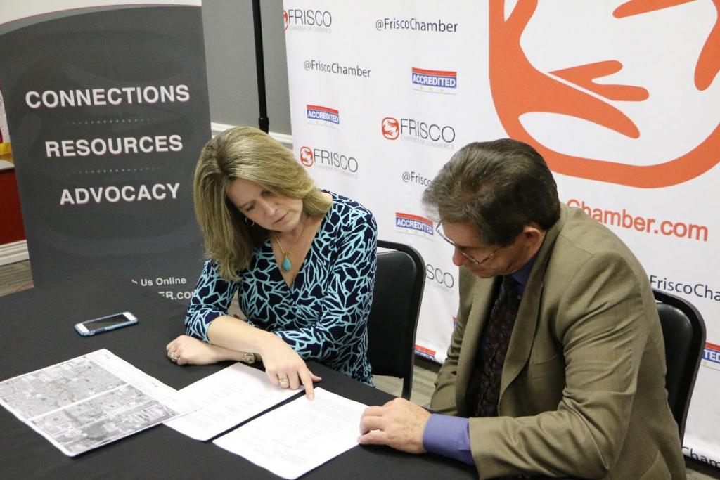 Shona Huffman, Frisco Chamber of Commerce Director of Governmental Affairs (l) and Tony Felker, President/CEO of the Frisco Chamber of Commerce (r), review the Settlement Stipulation to bury proposed transmission lines on Main Street.